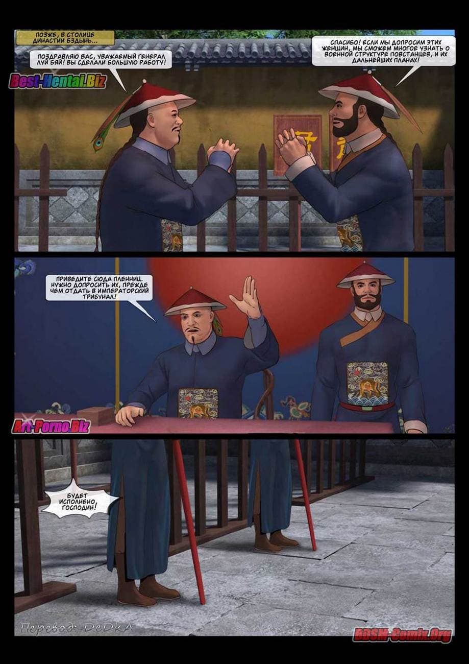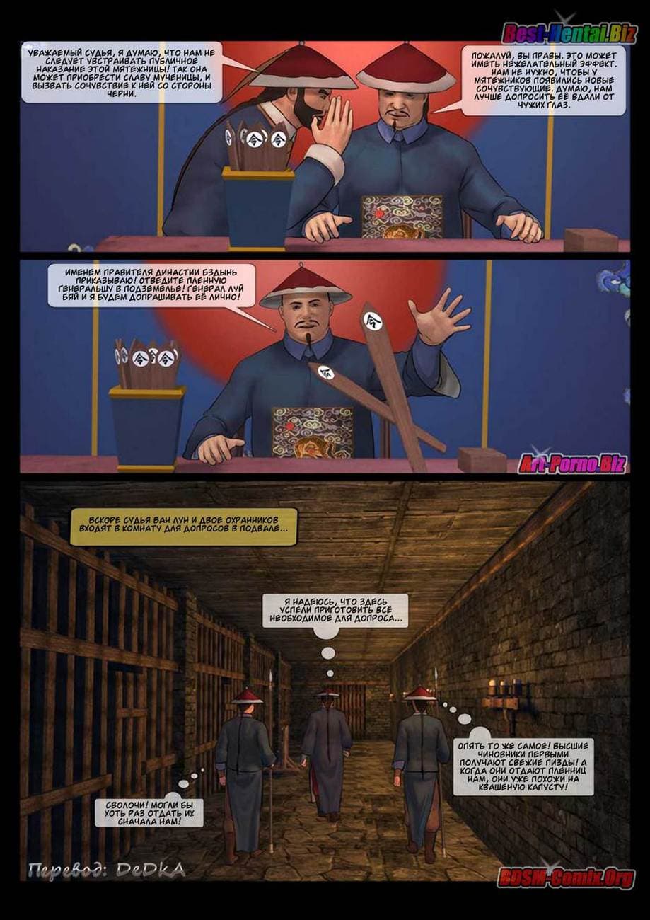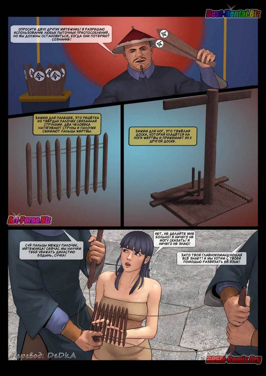 В этой части секс комикса бдсм вы узнаете, как Луй Бяй, коварный военачальник войск династии «Бздынь» захватил командующую хуйпинскими повстанцами
