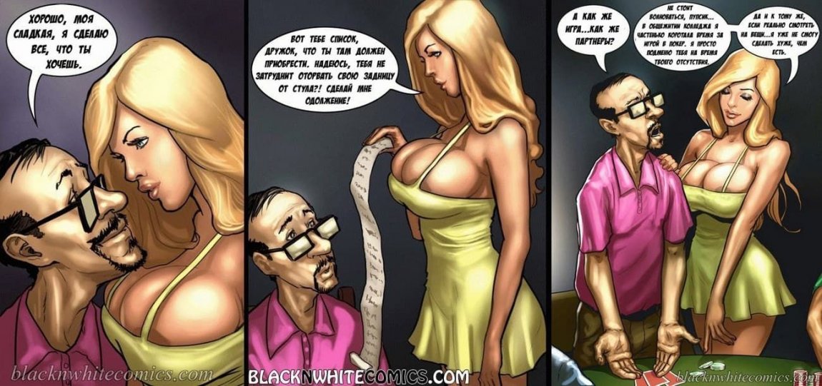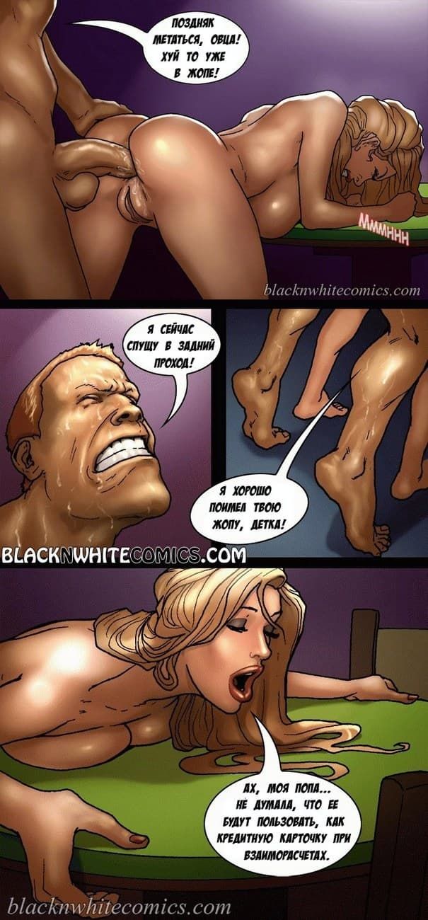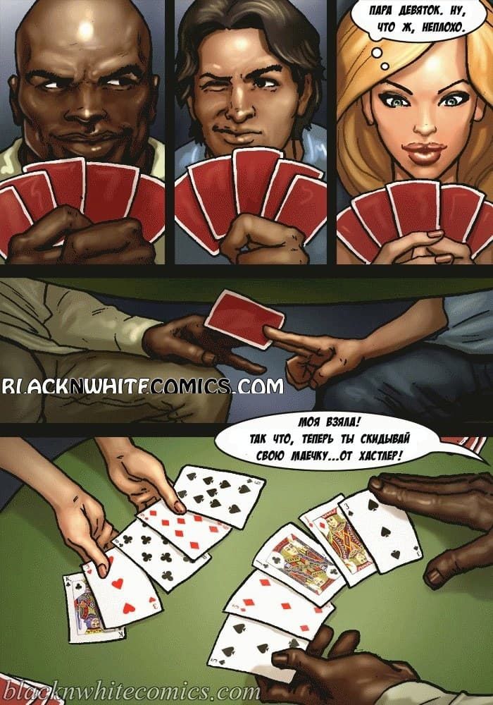 Порно комикс о том, как сексуальная женушка с большими сиськами проигралась друзьям мужа в карты, и за это они ее выебали во все дырки.