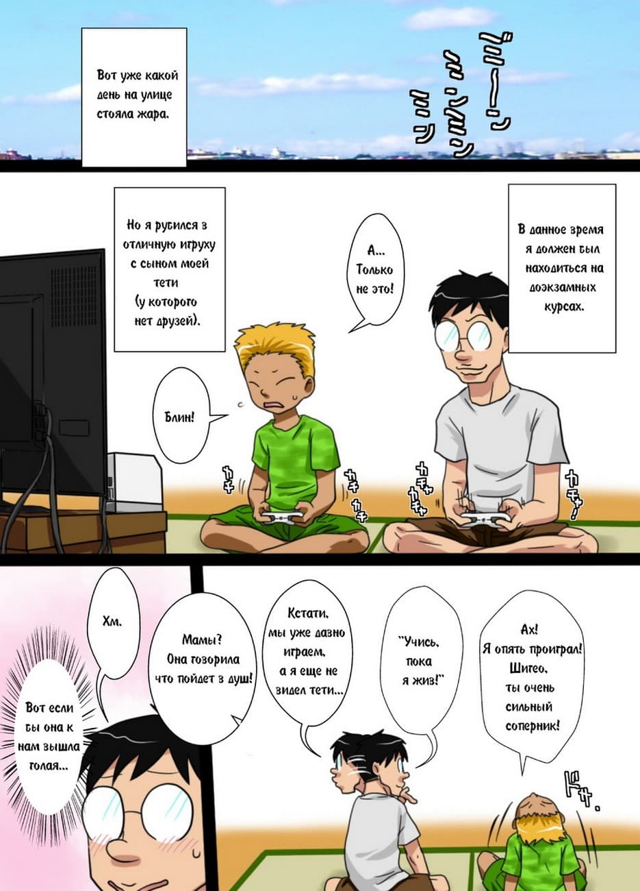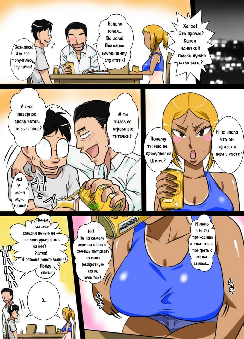 Цветной хентай комикс инцест, про подростка Шигео, который в очередной раз захотел жестко выебать свою симпатичную сисястую замужнюю тетю, и у него получилось.
